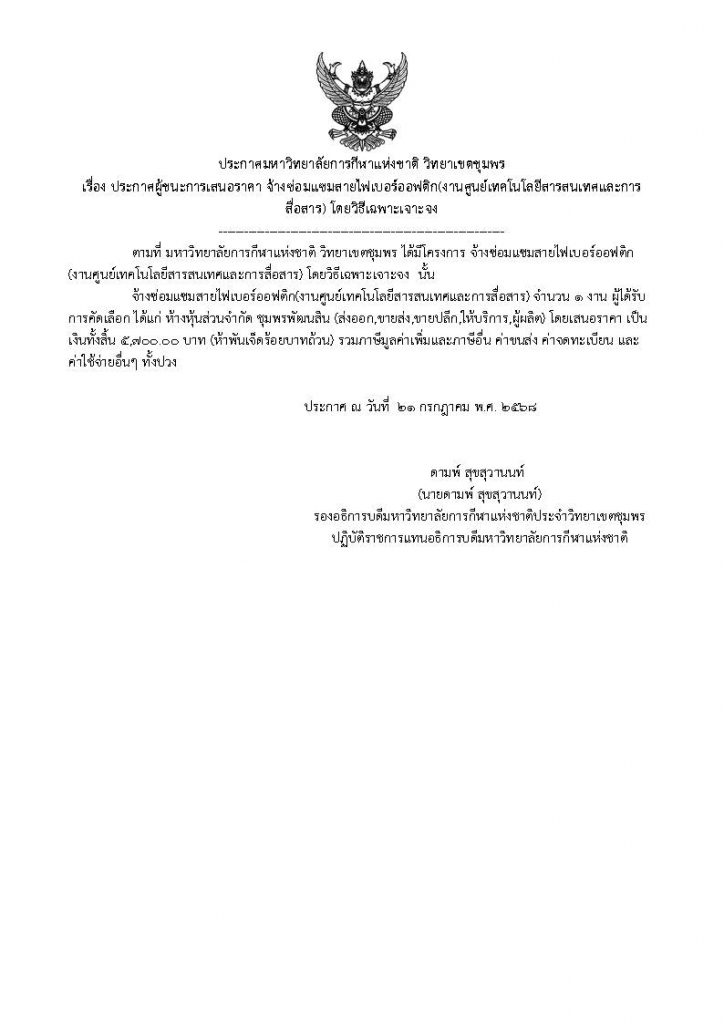 ประกาศผู้ชนะการเสนอราคา จ้างซ่อมแซมสายไฟเบอร์ออฟติก(งานศูนย์เทคโนโลยีสารสนเทศและการสื่อสาร) โดยวิธีเฉพาะเจาะจง