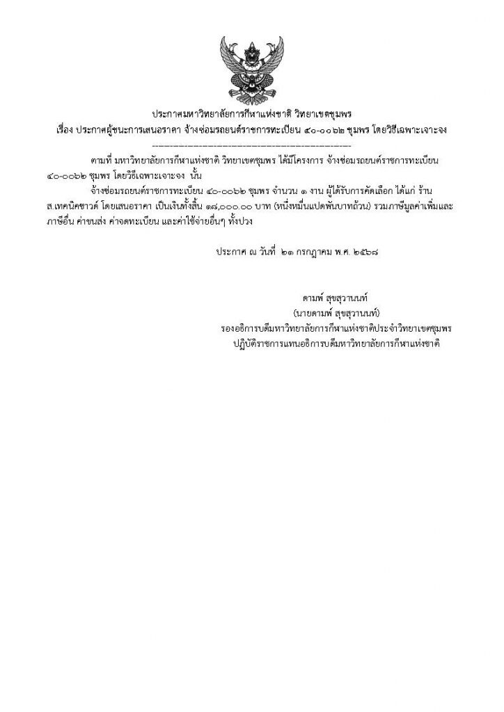 ประกาศผู้ชนะการเสนอราคา จ้างซ่อมรถยนต์ราชการทะเบียน ๔๐-๐๐๖๒ ชุมพร โดยวิธีเฉพาะเจาะจง