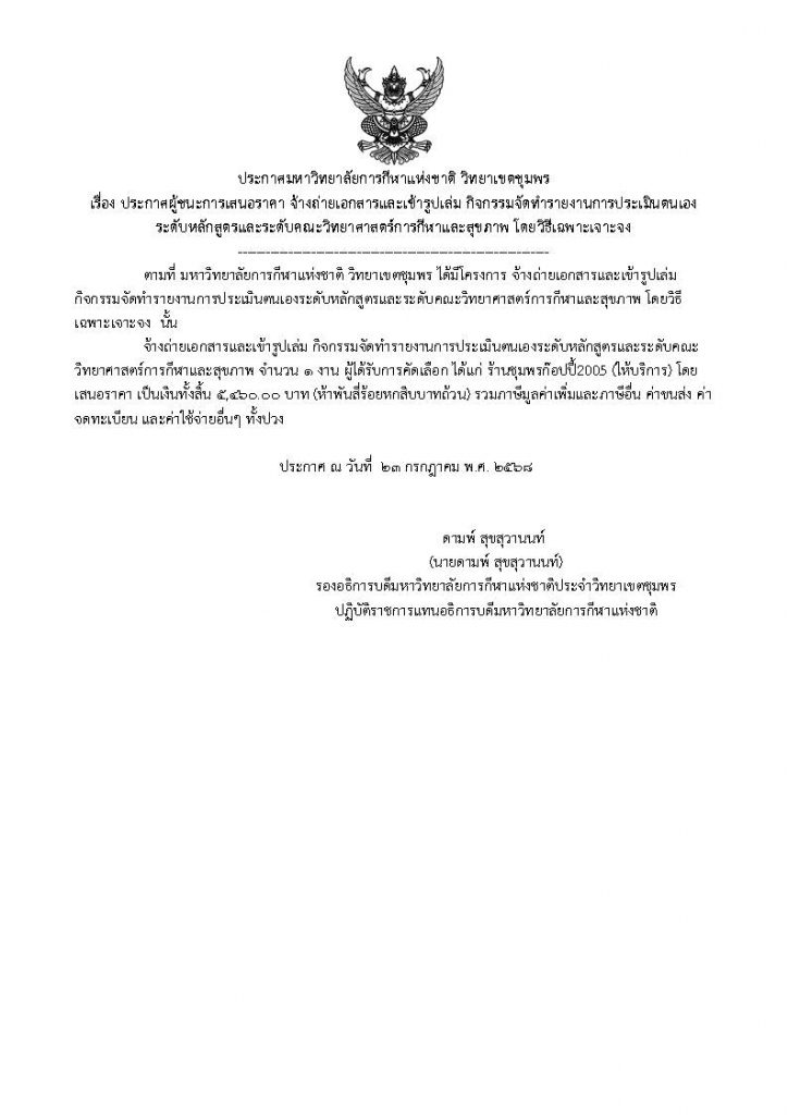 ประกาศผู้ชนะการเสนอราคา จ้างถ่ายเอกสารและเข้ารูปเล่ม กิจกรรมจัดทำรายงานการประเมินตนเองระดับหลักสูตรและระดับคณะวิทยาศาสตร์การกีฬาและสุขภาพ โดยวิธีเฉพาะเจาะจง