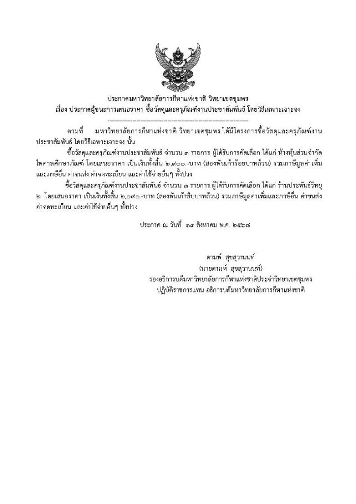 ประกาศผู้ชนะการเสนอราคาซื้อวัสดุและครุภัณฑ์งานประชาสัมพันธ์ โดยวิธีเฉพาะเจาะจง