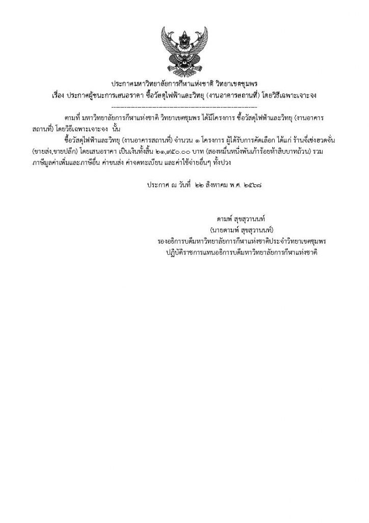 ประกาศผู้ชนะการเสนอราคา จ้างเหมาเอกชนดำเนินงาน ตำแหน่งเจ้าหน้าที่ธุรการฝ่ายกิจการนักศึกษาและกิจการพิเศษ โดยวิธีเฉพาะเจาะจง