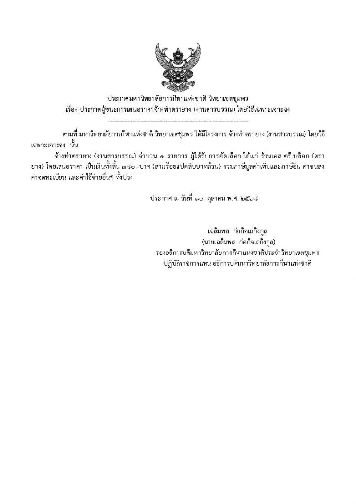 ประกาศผู้ชนะการเสนอราคาจ้างทำตรายาง (งานสารบรรณ)โดยวิธีเฉพาะเจาะจง