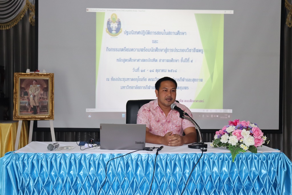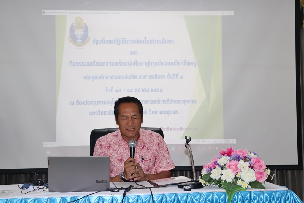 จัดโครงการปฐมนิเทศปฏิบัติการสอนในสถานบันการศึกษา และกิจกรรมเตรียมความพร้อมนักศึกษาสู่การประกอบวิชาชีพครู หลักสูตรศึกษาศาสตร์บัณฑิต สาขาพลศึกษา ชั้นปีที่ 4 วันที่ 14-18 ตุลาคม 2568 ณ ห้องประชุมหาดอรุโณทัย คณะวิทยาศาสตร์การกีฬาและสุขภาพ โดยมีนายเฉลิมพล ก่อกิจเถกิงกูล รองอธิการบดีมหาวิทยาลัยการกีฬาแห่งชาติประจำวิทยาเขตชุมพร เป็นประธานในพิธีเปิดโครงการ