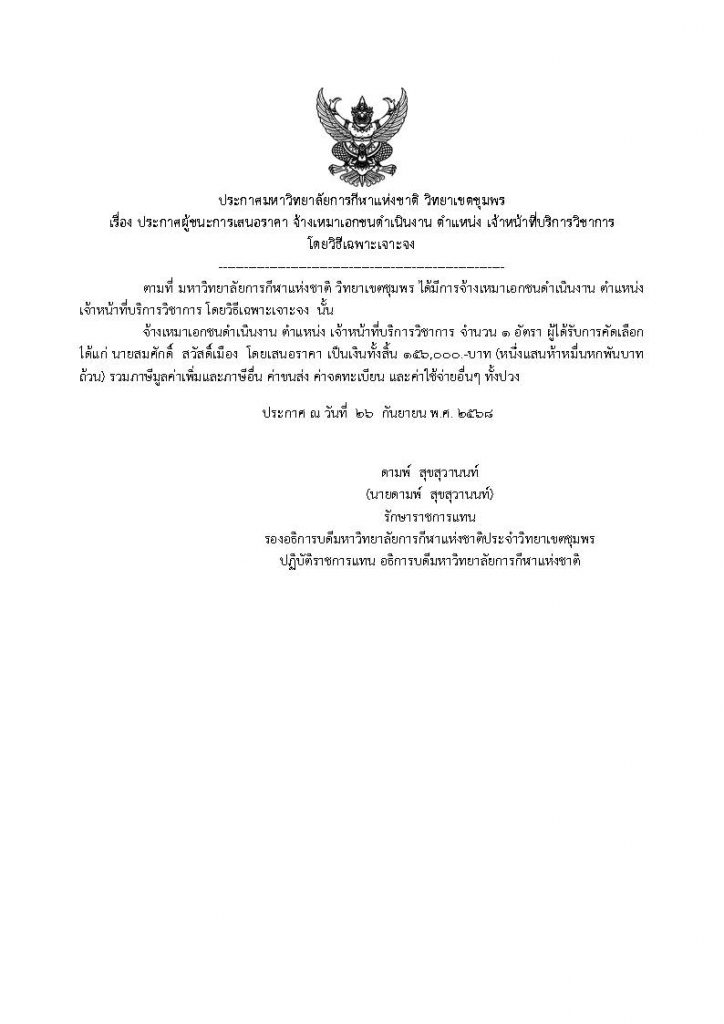 ประกาศผู้ชนะการเสนอราคา จ้างเหมาเอกชนดำเนินงาน ตำแหน่งเจ้าหน้าที่ธุรการฝ่ายกิจการนักศึกษาและกิจการพิเศษ โดยวิธีเฉพาะเจาะจง