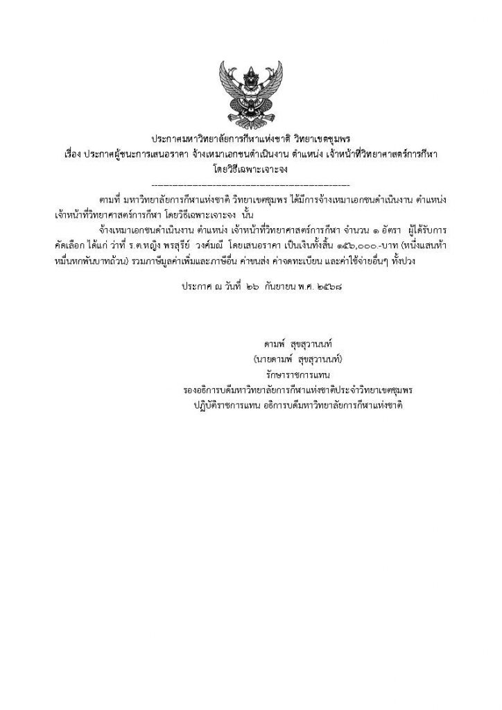 ประกาศผู้ชนะการเสนอราคา จ้างเหมาเอกชนดำเนินงาน ตำแหน่งเจ้าหน้าที่วิทยาศาสตร์การกีฬา โดยวิธีเฉพาะเจาะจง